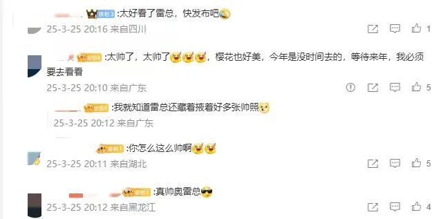 网友们纷纷在评论区留言:”太帅了雷总!樱花也好美!“”你怎么这么帅啊!“